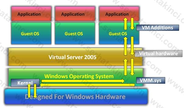 Yine en alttaki bölüm fiziksel kaynakları temsil ediyor. Fiziksel donanımın hemen üzerinde yine bir işletim sistemi çalışıyor ve bu işletim sisteminin hemen üzerinde bir Application yani uygulama katmanı var ve bu katmanda çalışan uygulama Virtual Server 2005 sanallaştırma yazılımı. Dikkat ederseniz buraya kadar olan senaryo bir önceki geleneksel fiziksel sistem mimarisi ile aynı. Virtual Server 2005 bir sanallaştırma yazılımı olsa da yapısı gereği altında bulunan işletim sistemi üzerinde çalışmak zorundadır. Yani aslında alt taraftaki Host işletim sistemi açısından herhangi bir uygulama konumundadır. Bu senaryoda VM’ler yani sanal makineler Virtual Server 2005 üzerinde çalışır. Sanal makinelerin içlerinde ise sanal işletim sistemleri (Guest OS) ve sanal uygulamalar (Guest Application) yer alır.